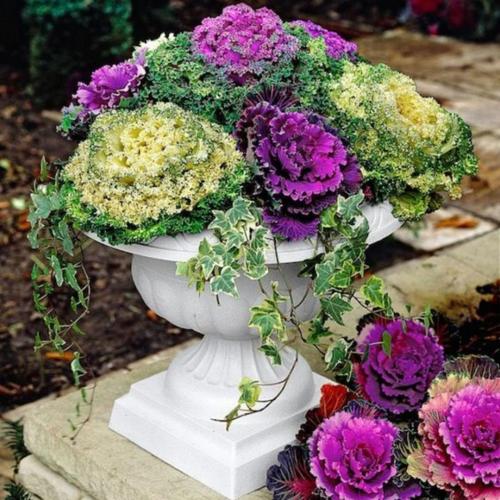 Декоративная капуста — это эффектное двухлетнее растение, широко используемое в ландшафтном дизайне как однолетнюю культуру благодаря ее ярким, причудливым листьям, напоминающим большие цветы или розы. Она ценится за способность сохранять свою декоративность до поздней осени и даже после первых заморозков, когда многие другие цветы уже отцвели. Вместо привычного кочана, декоративная капуста формирует розетку больших, гофрированных, волнистых или вьющихся листьев. Сердцевина растения окрашивается в яркие цвета — от белого и кремового до розового, фиолетового и насыщенно-красного, контрастирующих с наружными зелеными листьями. Растение холодостойкое и может выдерживать температуры до -6°C, а взрослые растения - до -8°C. Высаживается на клумбах, рабатках, в бордюрах, а также отлично подходит для выращивания в контейнерах и горшках на балконах или террасах. Она придает объем и текстуру цветочным композициям. Декоративная капуста несъедобна.