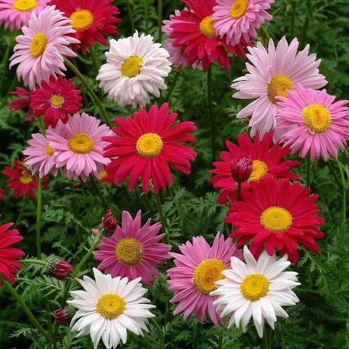 Пиретрум Робинзон, смесь — крупноцветная многолетняя смесь, которая принадлежит к семейству хризантем. Травянистое растение формирует аккуратный кустик до 50 см высотой. Соцветия крупные, до 8 см в диаметре, с яркими лепестками и выразительной серединкой. Стебли крепкие, листья ажурные, темно-зеленые. Пиретрум зацветает летом и держит цветок почти до осени. Гармонично смотрится в групповых посадках и смешанных цветниках. Растение не только украшает сад, но и выполняет защитную функцию – его аромат отпугивает вредных насекомых.